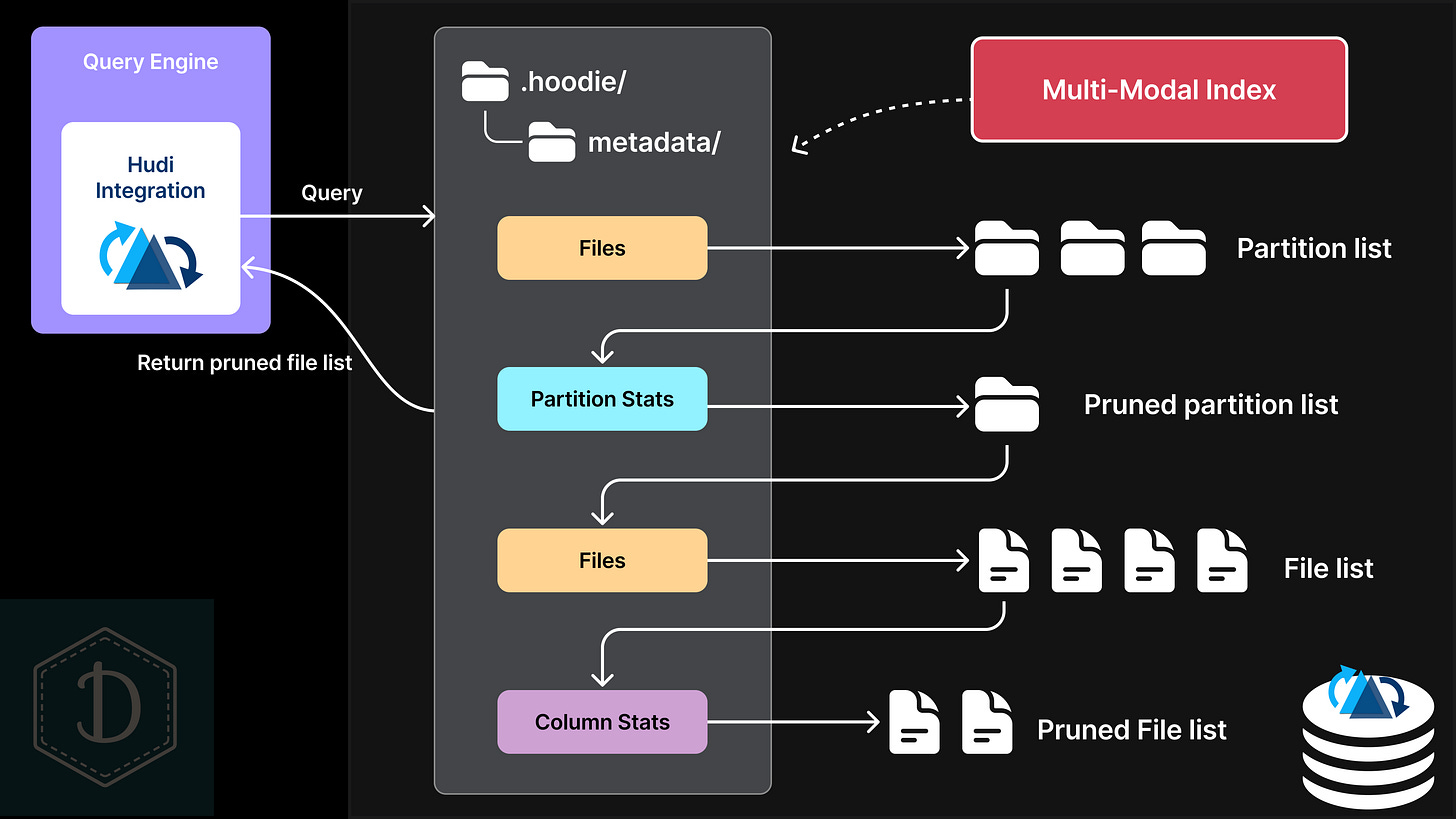 Hudi's multi-modal index lives within the .hoodie/metadata/ directory and has an interesting design: it's actually implemented as its own Hudi Merge-on-Read table, known as the metadata table. This metadata table gets updated synchronously alongside any write operations to your main data table, ensuring everything stays consistent and in sync.