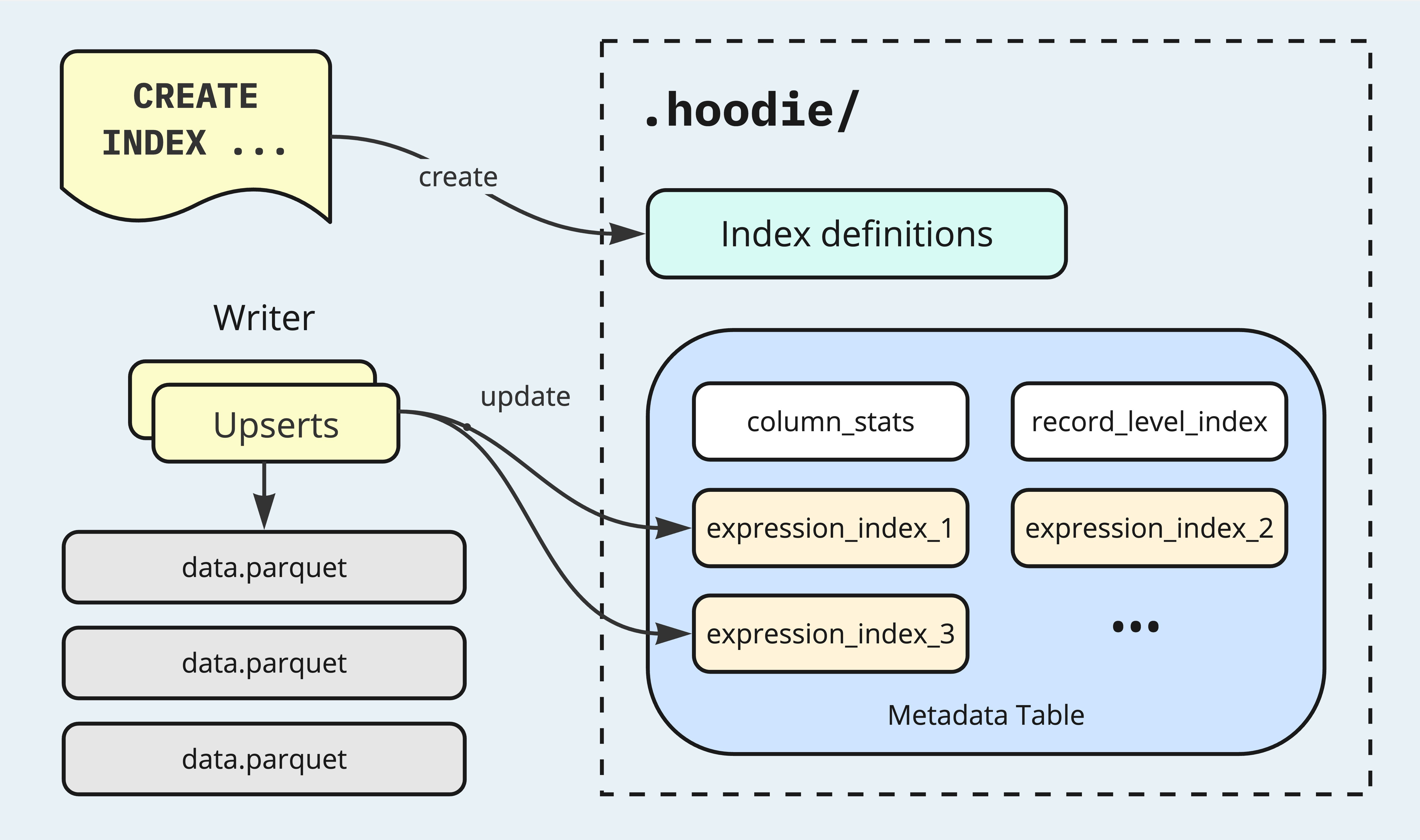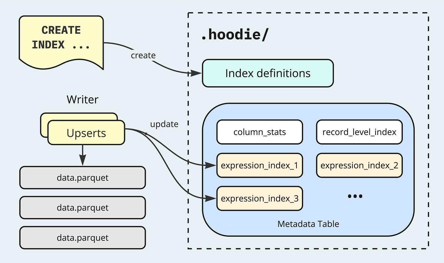 CREATE INDEX ts_hour ON hudi_table USING column_stats(ts) options(func='hour');Hudi stores user-created index definitions under a dedicated directory under the metadata path .hoodie/. These definitions inform query engines about the available indexes, facilitating more optimized query planning. The index entries are maintained under separate partitions within the Metadata Table, which serves as the indexing subsystem for the enclosing Hudi table. When writers commit changes, all the available Expression Indexes are updated to reflect these changes, in a manner similar to other enabled indexing features in the Metadata Table. This ensures that indexes remain up-to-date, maintaining high levels of efficiency for both read and write operations.