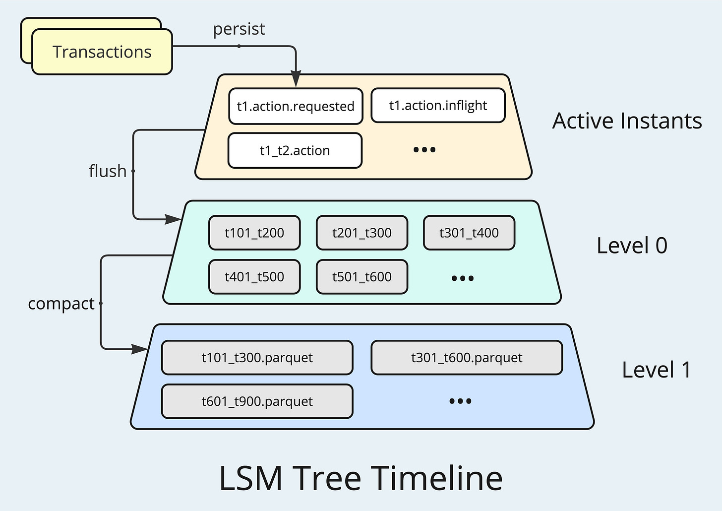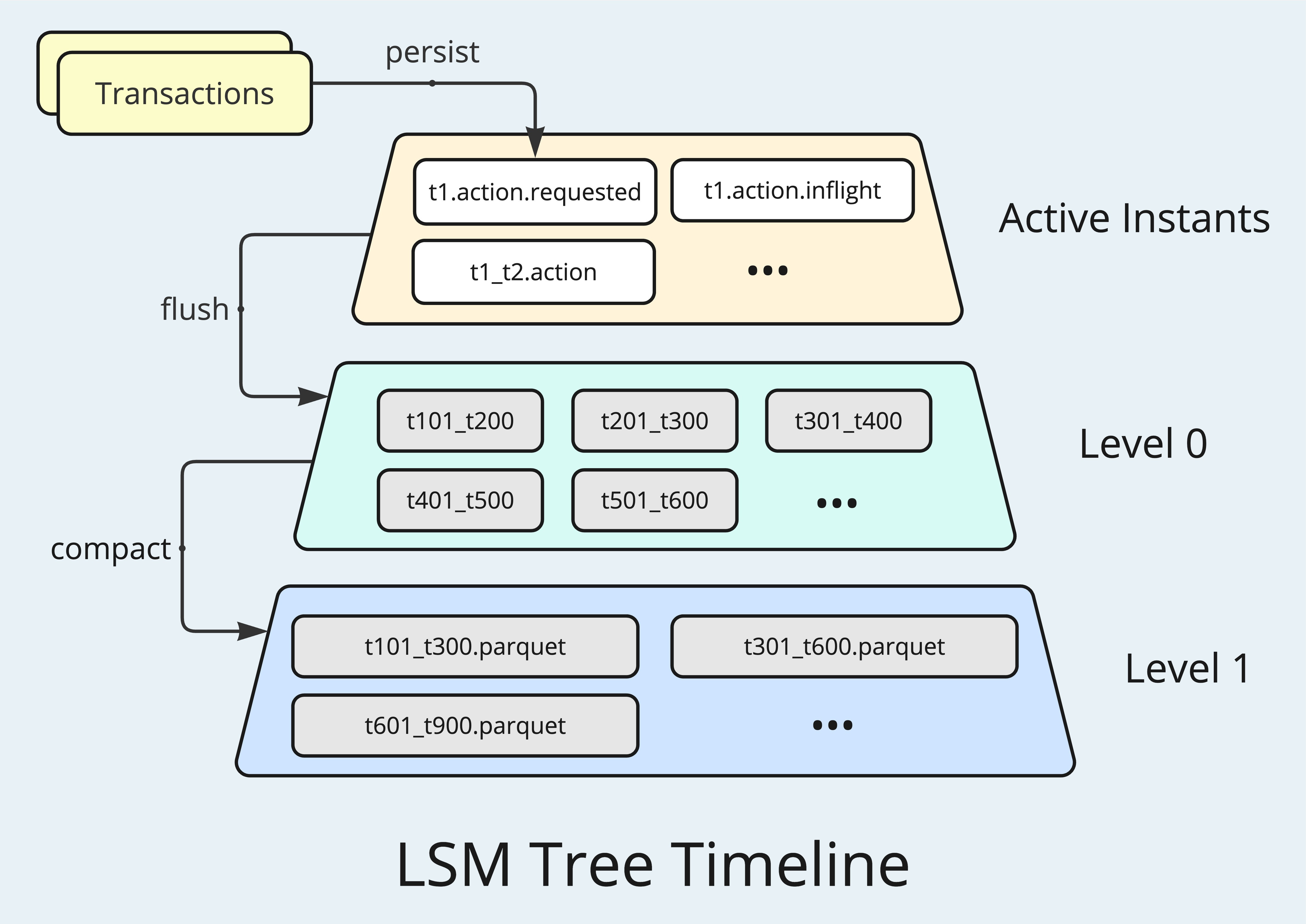 LSM Tree is a multi-layered data structure designed for high write throughput. At the top layer, Hudi Timeline stores the transactions as active instants, having individual Avro files recording the metadata for each transaction's states: requested, inflight, and completed. When exceed a certain threshold, the active instants will be flushed to Parquet files, forming the first storage-optimized layer. The transactions are grouped and sorted chronologically, and the file names contain time range information, allowing efficient retrieval through manifest files. When the number of Parquet files stored at one level exceeds a certain limit, the files will be compacted and pushed down to the next level as larger files with more Timeline instants, further improving storage efficiency. Additionally, these highly compressed Parquet files are optimized for query performance, particularly when time-range filters or specific columns are targeted, ensuring fast data retrieval.