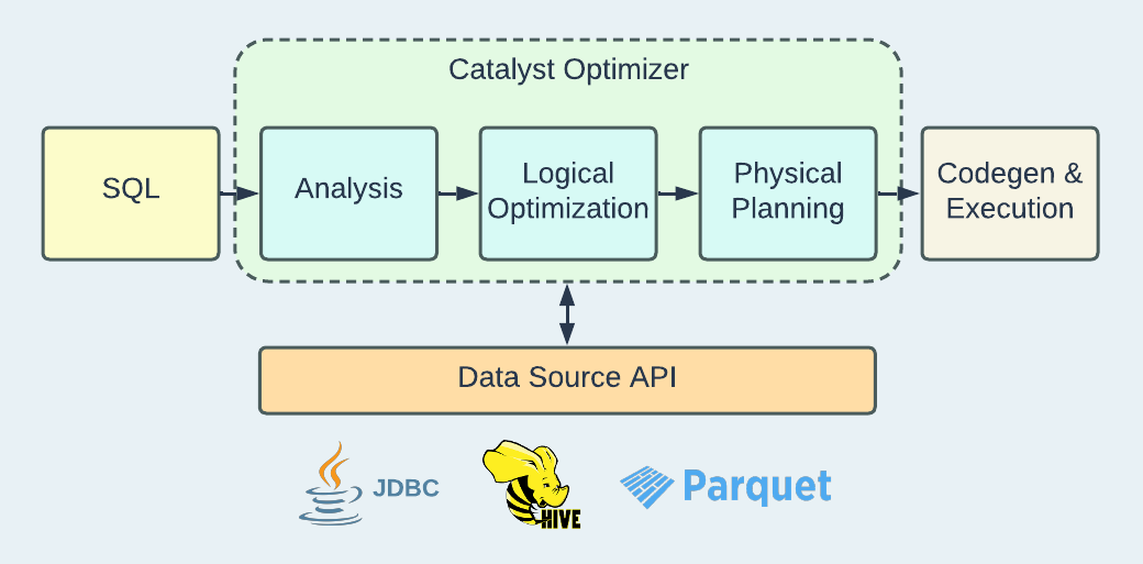 Spark SQL is a distributed SQL engine that performs analytical tasks for large-scale data. A typical analytics query begins with user-provided SQL, aiming to retrieve results from a table on storage. Spark SQL takes this input and proceeds through multiple phases, as depicted in the diagram below.