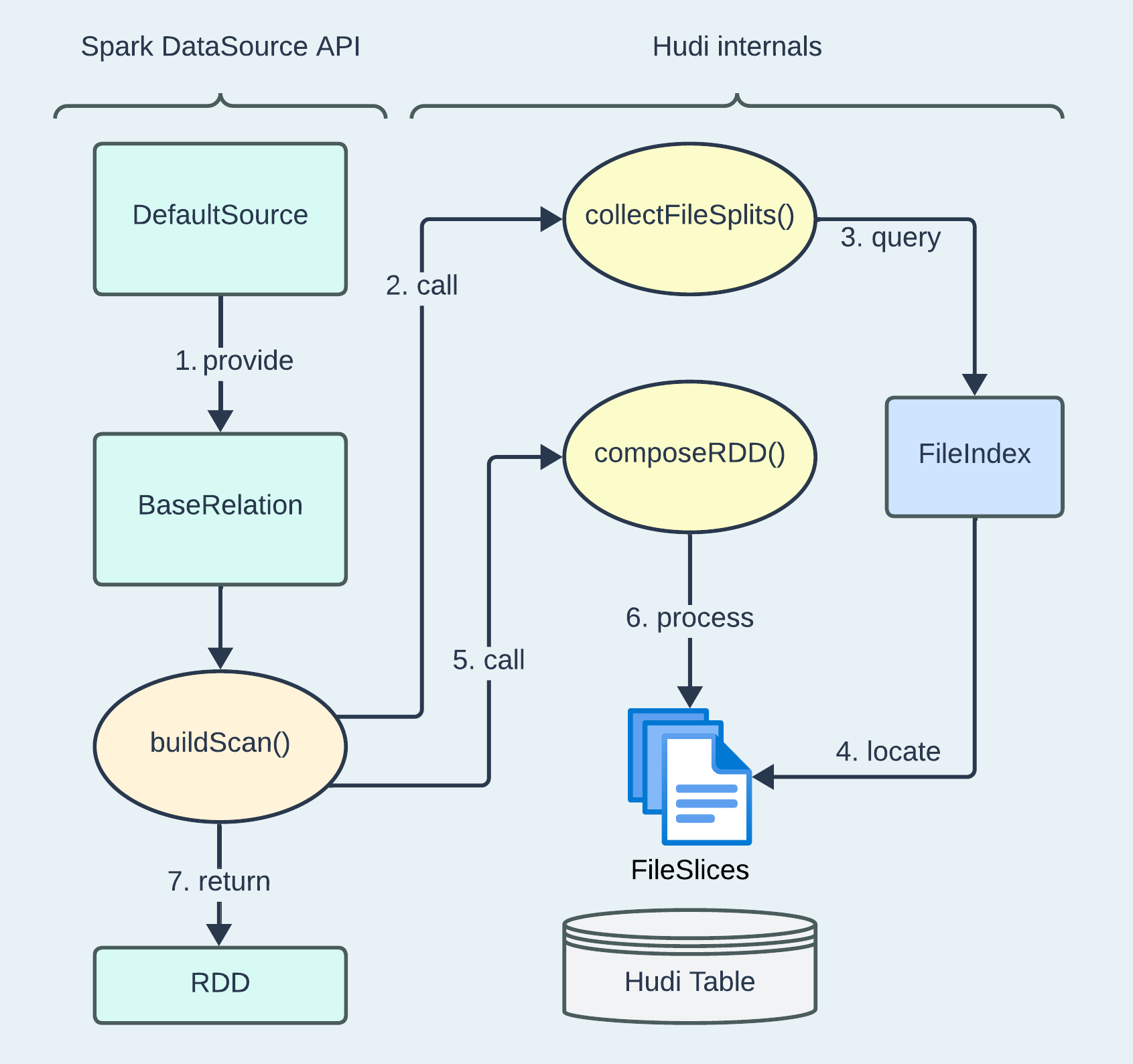 DefaultSourceserves as the entry point of the integration, defining the data source’s format asorg.apache.hudiorhudi. It provides aBaseRelation, which Hudi uses to implement the data extraction process.buildScan()is a core API to pass filters to data sources for optimizations. Hudi definescollectFileSplits()for gathering relevant files.collectFileSplits()passes all the filters to aFileIndexobject that helps identify the necessary files to read.FileIndexlocates all the relevantFileSlices for further processing.composeRDD()is invoked afterFileSlices are identified.FileSlices are loaded and read out asRDDs. For columnar files like Base Files in Parquet, this read operation minimizes the transferred bytes by reading only the necessary columns.RDDs are returned from the API for further planning and code generation.