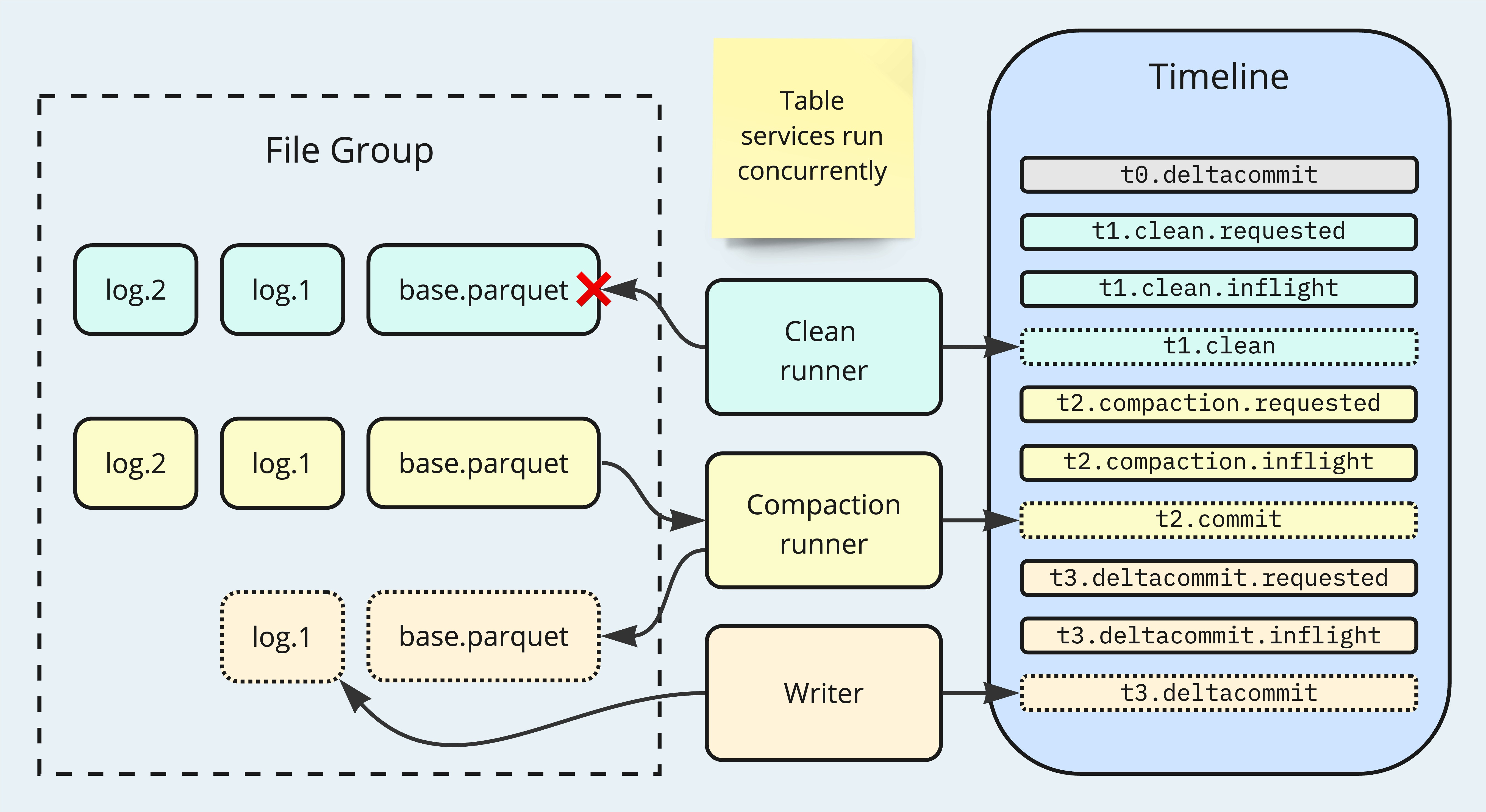 When a write operation is in progress, a commit action indicating this write will be marked as "requested" or "inflight" on the Timeline. This makes the table file-system view aware of the ongoing action, ensuring that table service planners do not include the File Slices currently being written for subsequent execution. This logic also holds true in the scenario of concurrent table service jobs. Hudi's table services are idempotent operations because the plans containing information about which File Slices to read are persisted. Therefore, retries in the event of failure won't impact the final result.