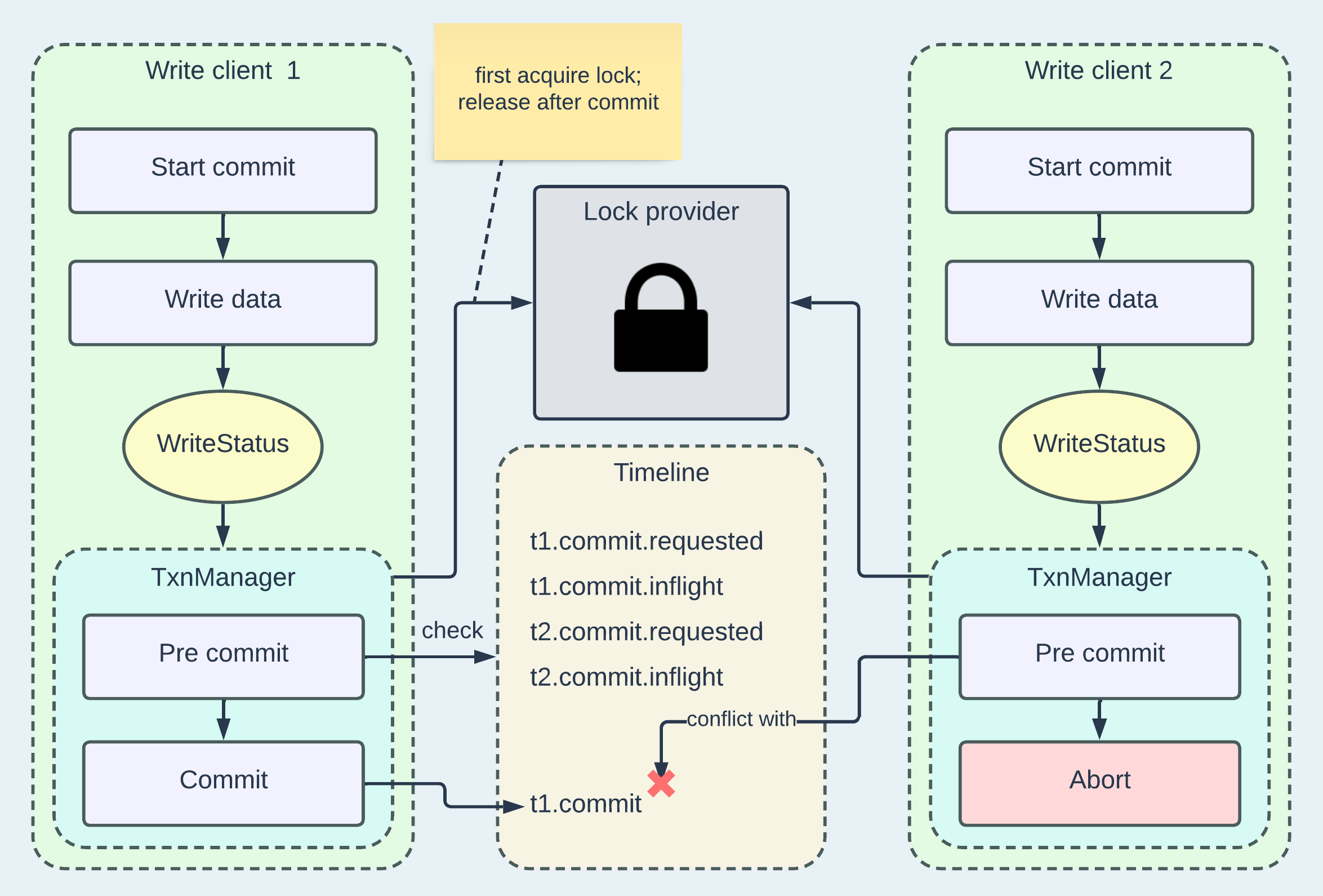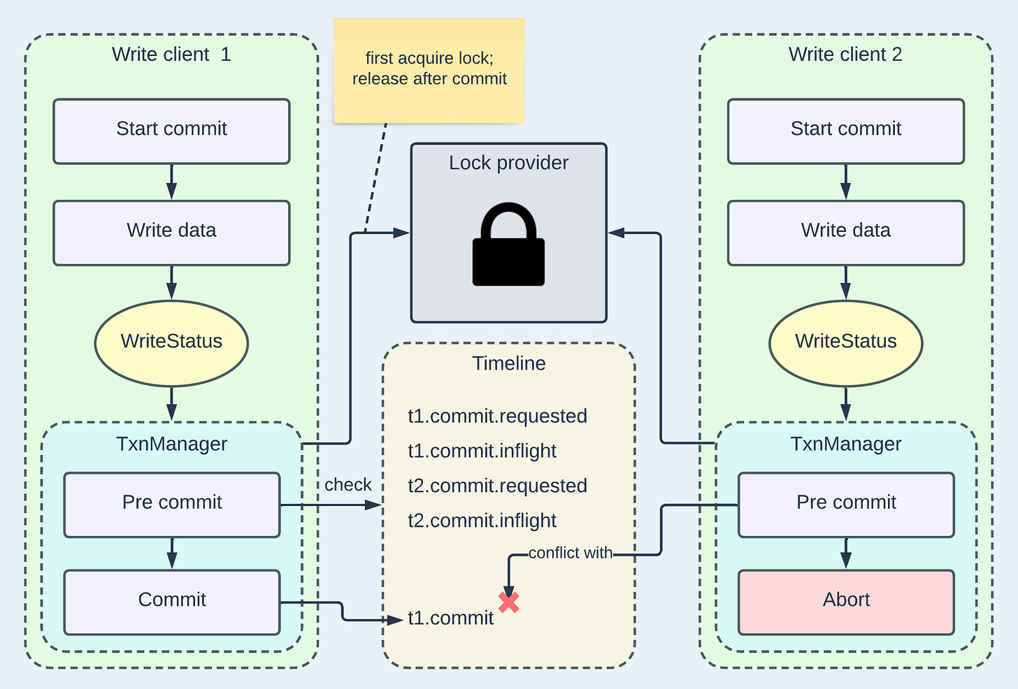 Write client 2 is writing t2.commit and acquires the lock after client 1 releases it. In the pre-commit phase, the changed files by client 2, obtained from WriteStatus, conflict with the changed files by client 1, derived from t1.commit. Consequently, client 2 will abort the write.
