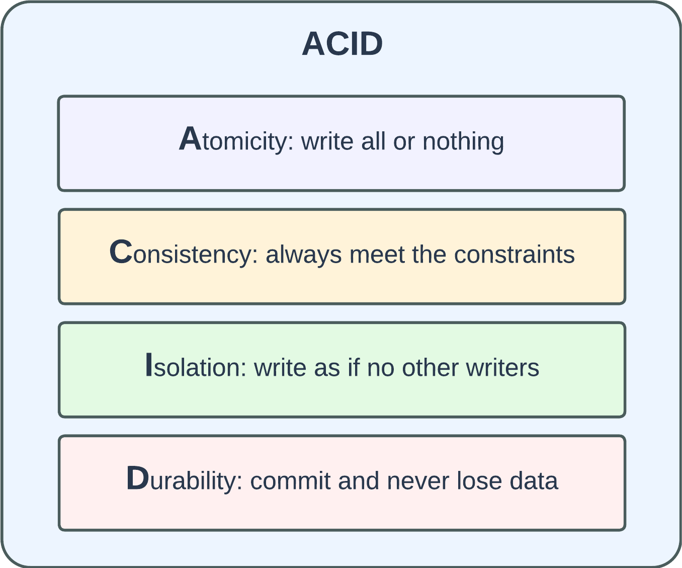 In databases, ACID are 4 essential properties to maintain the integrity and reliability of transactions. In the chart provided below, I've presented a brief summary of ACID, attempting to leave a clear and easily memorable overview.
