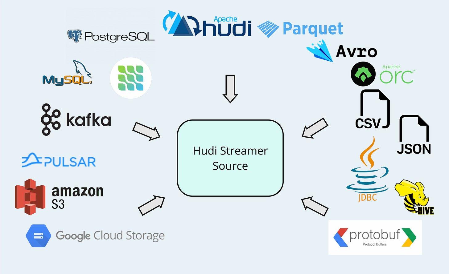 Source is an abstraction for providing upstream source data for Hudi Streamer. Its primary responsibility is fetching data from the source system as an input batch for processing and writing. By extending the Source abstract class, Hudi Streamer can be seamlessly integrated with a wide range of data systems. Designed with a platform vision from day one, Hudi currently offers more than a dozen of Source implementations off-the-shelf, as shown in the following picture.